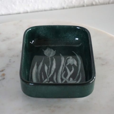 Fin vintage skål fra svenske Deco Helsingborg (Deco Keramikfabrik eksisterede fra 1930-1980'erne). Motiv af vinranke, flot mørkeblå glasur.