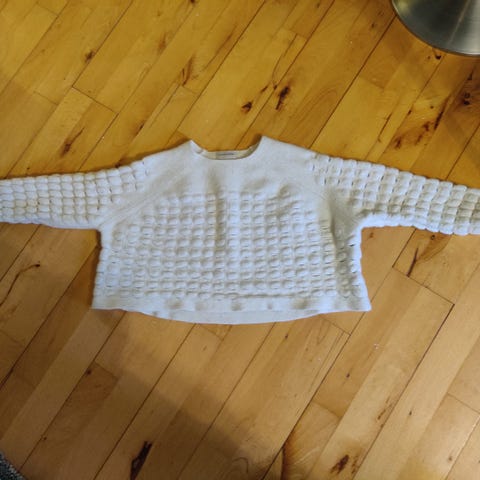 By Malene Birger striktrøje med stor og flot krave i sandfarvet. Str. Xs. Helt ny, stadig med prisskilt. Style: Fevila. 100% uld. Den er stor i størrelsen og svarer mere til en oversize str. S/M. Nypris: 2199kr