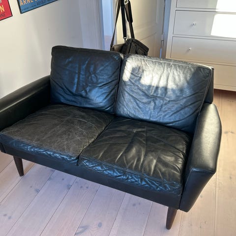 Læde sofa 2 personer sort betrækk og bøg træ , skal gøre rent har stået i et ikke brgt rum i 5 år 400 kr kontant eller 500 kr på mobilpay står på et værelse på loftet