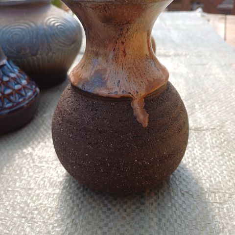 Vasen har en kombination af en glat, glaseret top og en ru, struktureret bund i keramisk materiale.