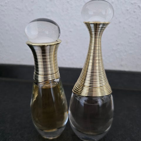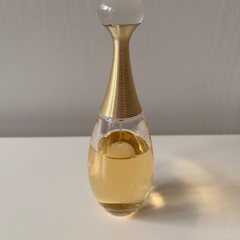 Dameparfume, Parfume - duft , J'ADORE - Dior, EAU DE Toilette. Parfumen er 5 år gammel og mangler tuden og dimsen, til at spraye med, man kan selv sætte én på, tænker jeg.