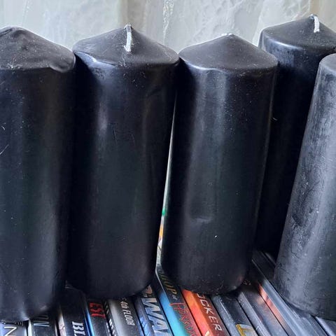 10 fine orange lys ca. 24 cm høje. Skåret ind i bunden, så de passede til at stå i flaske til temafest, men ikke brugt.