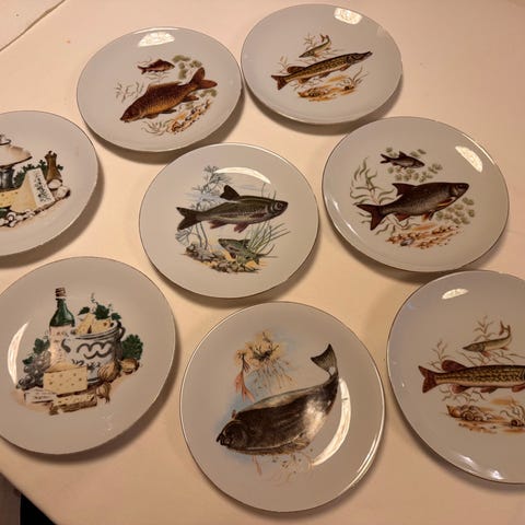 6 håndmalede rimelig retro middagstallerkener.