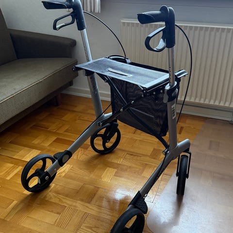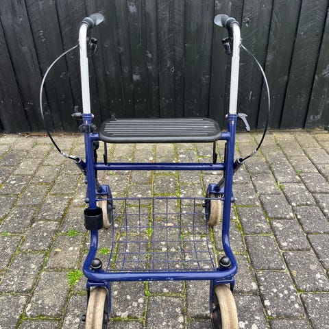 Rollator med sæde og bremser i blå stål. Udstyret med fire hjul, håndbremser og et fast sæde, der giver mulighed for at hvile under brug. Designet til at støtte gang og mobilitet. Fungerer som den skal. 200 kr. fast pris. Jeg sender ikke