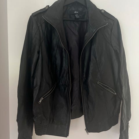 Ellos sort læderjakke til kvinder i størrelse 46. Jakken har en klassisk biker-stil med lynlåslukning, lynlåslommer og bælte i taljen. Fremstillet i læder med detaljer i metal. Lammeskind