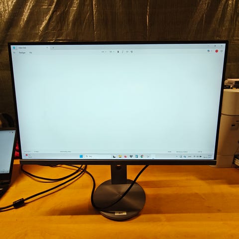 Skærmen har fuld ergonomisk fod – kan drejes, vippes, hæves/sænkes og roteres 90° til portrætvisning.