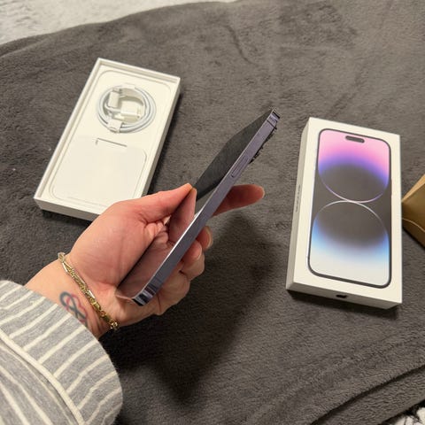 Apple iPhone 14 Pro Max smartphone med 256 GB lagerplads i lilla farve. Enheden har en stor skærm, avancerede kameraer på bagsiden og leveres med original emballage og et beskyttelsescover. Designet til både hverdagsbrug og avancerede mobilfunktioner.
