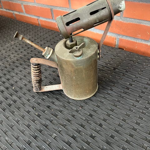 Antik messing blæselampe mærket Trade Mark Made in Sweden, The Swedish Lamp. Den vipper i bunden når den står .