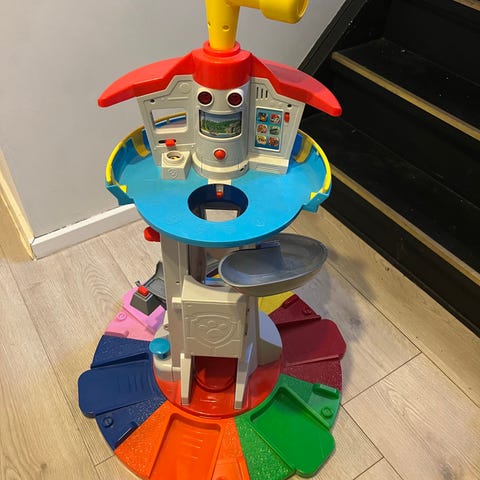 Paw Patrol legetårn med flere niveauer, inkluderer små (4) køretøjer og funktionelle lys og lyd. Legetårnet har en spiralrutschebane og forskellige interaktive elementer.