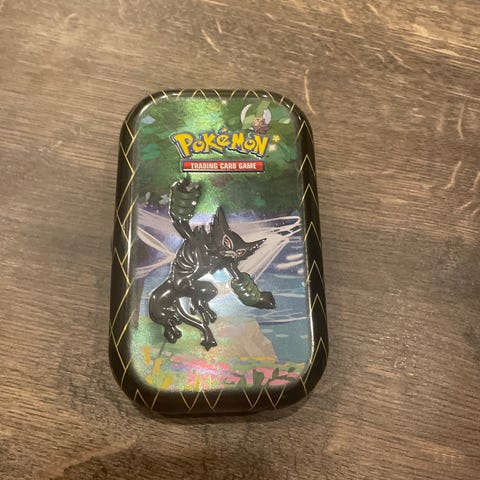 Pokémon Trading Card Game Metal Tin indeholder en samling af Pokémon kort i forskellige designs og farver. Tinæsken har et motiv med Pokémon-figurer og bruges til opbevaring og beskyttelse af kortene. Kortene varierer i type og sjældenhed og kan bruges til spil eller samling.