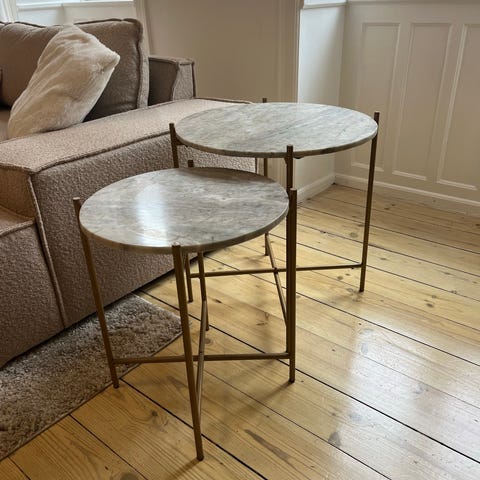 To grålige marmorborde velegnede som fx natborde eller sofaborde sælges samlet.