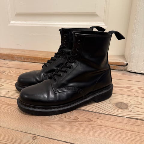Dr. Martens støvler i sort læder, størrelse 42. Støvlerne har snørebånd og karakteristisk gul syning langs sålen. Designet til både funktion og holdbarhed.