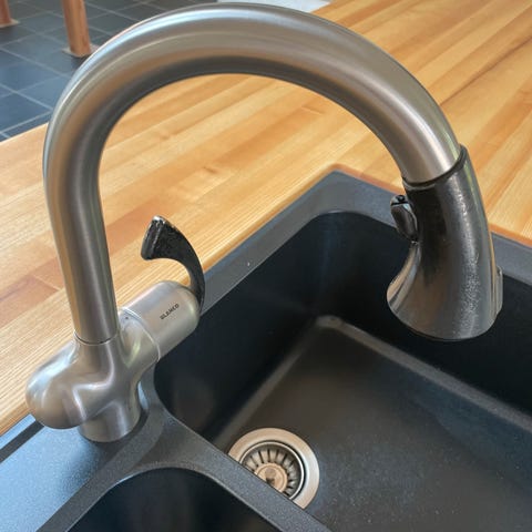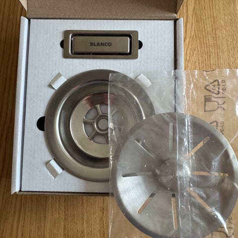 Blanco Afløbssæt til køkkenvask består af en rustfri stålrist og monteringsdele. Sættet er designet til installation i køkkenvaske og inkluderer nødvendige fittings og skruer til montering.