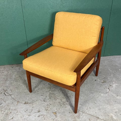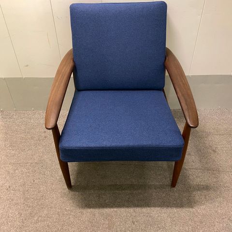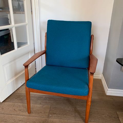 Grethe Jalk, Teak, Lænestol, Lænestol dansk design 1960’erne. Designet af Grethe Jalk. Fremstår flot og med professionelt tilpasset nyt hyndesæt i petroliumsfarvet uld.