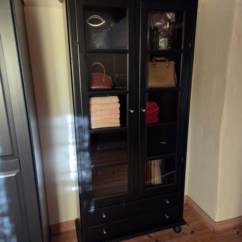 Lille robust og rummeligt vitrineskab med glashylder, skuffe og udskæringer på låger. Skabet fremstår som nyt og sælges pga. pladsmangel.
