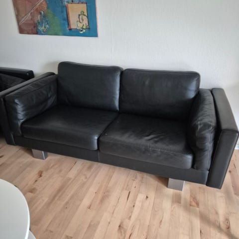 2,5 personers sofa fra 2023, i sort blød læder, er rigtig lækker at sidde i, sorte ben, høj kvalitet.
