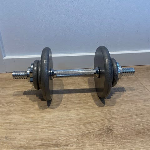 Nordic strength Justerbar Håndvægt med en samlet vægt på op til 14. Med flere vægtskiver, der kan tilpasses efter behov. Håndvægten har en metalstang med greb og sikkerhedsklemmer for fastspænding af vægtskiver. Velegnet til styrketræning og fitnessbrug.