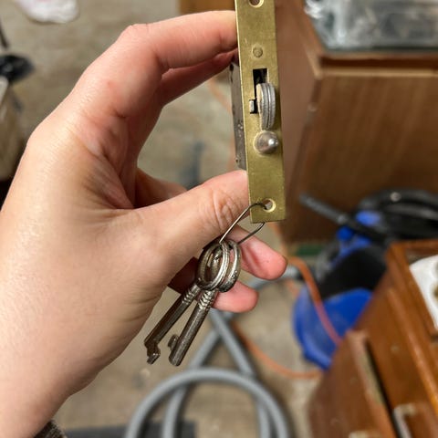Nøgle og låsesæt i metal, indeholdende flere låseplader, håndtag, og en nøgle med nummer 15091. Sættet er egnet til montering på smalle døre, fx i et skab og består af forskellige metaldele med nøglehuller og håndtag.