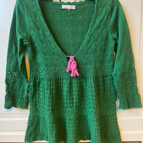 Flot blød strik med hulmønster. Tunikaen er i empire snit og har dyb V-udskæring og 3/4 lange ærmer. Bindes med bånd i nakken.