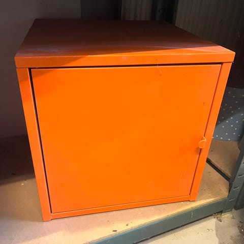 Lille, sennepsgult metalskab i rå og industriel stil. Har to indre hylder, og kan som en sjov detalje klappes sammen.