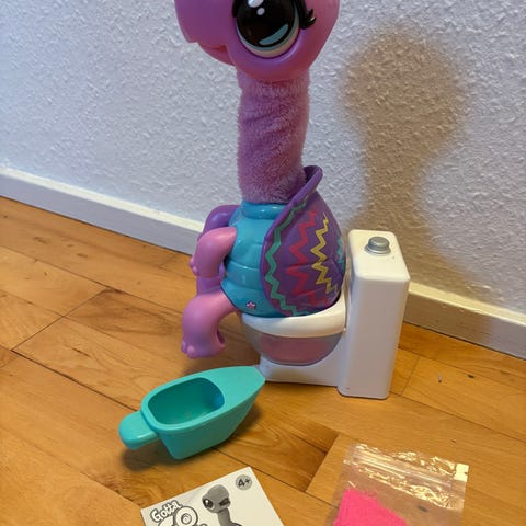 Sherbet er en Gotta Go Flamingo og en helt igennem sjov fugl! Denne interaktive, lyserøde Flamingo elsker at snakke, synge, danse, spise og gå på toilettet! Åbn Sherbets mund og giv ham hans magiske Flamingo Food med skeen. Se derefter hans lange hals bølge og bule, mens han gulper det i sig! Når han begynder at synge sin sjove sang, så ved du, at "Uh Oh He's Gotta Go!" Sæt ham hurtigt på det medfølgende gennemsigtige toilet og se ham lave fantastisk, magisk farverig bæ i den vandfyldte toiletskål! Når han er færdig, kan du hælde bæen tilbage i skeen! Den tørrer på magisk vis tilbage til Flamingo Food, så du kan made Sherbet igen og igen! Ud over at synge elsker Sherbet også at tale. Den optager det, du siger, og gentager det! Med sine sjove bevægelser, lyde og reaktioner vil Sherbert og Gotta Go Flamingo få alle til at grine.