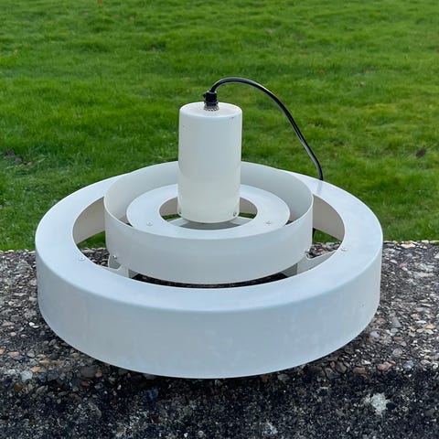 Jo Hammerborg equator-pendel i hvid. Designet af lampen har en karakteristisk lagdelt konstruktion, der skaber et flot lys både nedad og opad.