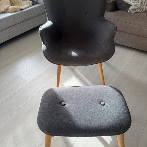 Lækker lænestol med armlæn og fodskammel , den kan justeres så man ligger halvt ned .