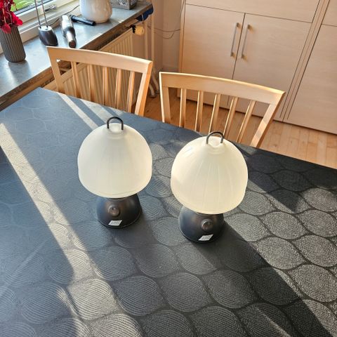 2 stk solcellelamper, kan også oplades med usbstik (medfølger) Kan bruges ude og inde, med og uden fod. Skærm er 20 x 16 cm og 31 cm høj med fod. Lyser som foto 1. Vi har brugt dem i sommer på campingtur, men har nu solgt campingvogn. Sælges samlet.