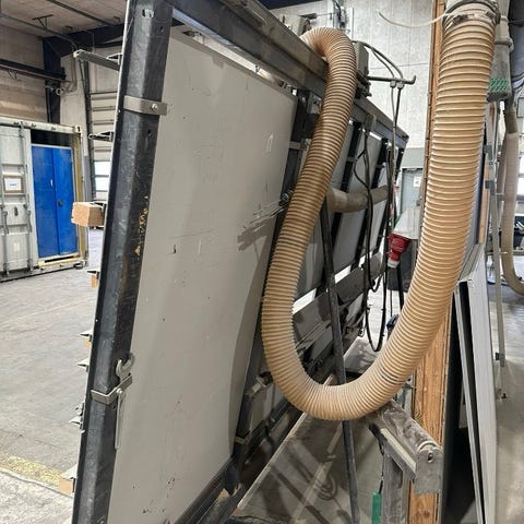 Max skæremål : L 4200 x D 4200mm, med forrids klinge, 4 stk luftborde foran saven, styre pult med optimering, skærelister, hukommelse med mere, kan ses i drift, CE mærket, nedtagning/transport/opstilling tilbydes, spørg efter video af maskinen i drift.
