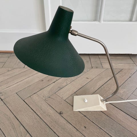 Gammel bordlampe med grøn emalje skærm fra 1950'erne