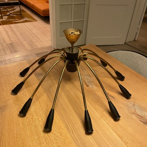 De er fra 1950'erne og er udført i messing med hele 12 buede messingarme med de originale gamle sputnik-fatninger (bruger alm. pærer E14). De 12 fatninger fordeler sig i 2 etager med 6 i hver.