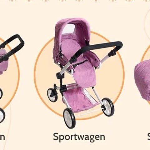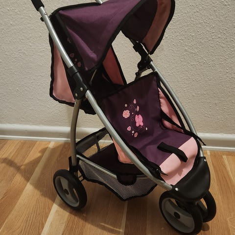 Bayer dukkevogn med lyserød og grå farve. Vognen har et stel i metal med tre hjul, hvoraf det ene er drejeligt. Tekstildelene er i lyserød og grå stof. Egnet til leg og transport af dukker.