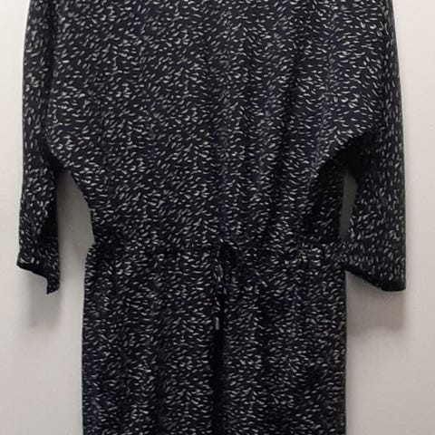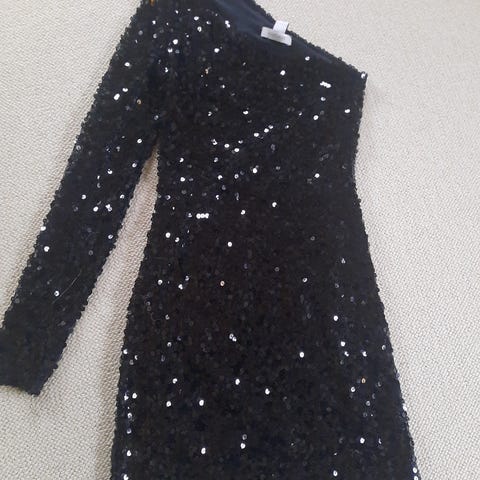 Kjolen er kort, har store satin pufærmer og lang lynlås i ryggen.