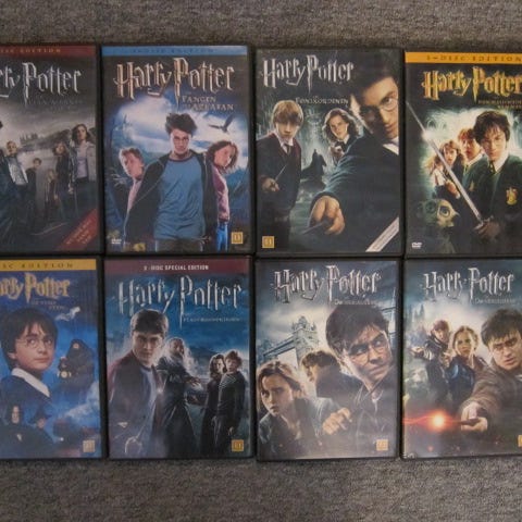 Harry Potter DVD sæt indeholder alle otte film i serien. Sættet inkluderer filmene: Harry Potter og De Vises Sten, Harry Potter og Hemmelighedernes Kammer, Harry Potter og Fangen fra Azkaban, Harry Potter og Flammernes Pokal, Harry Potter og Føniksordenen, Harry Potter og Halvblodsprinsen, Harry Potter og Dødsregalierne del 1 og del 2. DVD-formatet er standard og samlingen er velegnet til fans af Harry Potter-serien.
