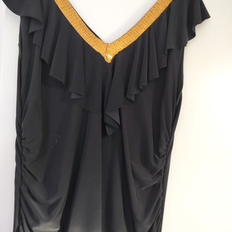 Kjolen er asymmetrisk med et ærme, kort og udført med sorte palietter.