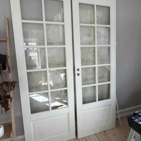 1 fransk dør med klart glas med samme mål. Ret medtaget på den ene side, så skal repareres og slibes (se billeder).
