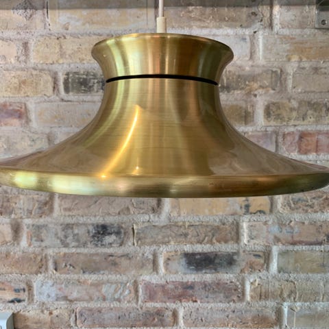 Carl Thore pendel designet med struktureret plastskærm med en kobber ring indeni.