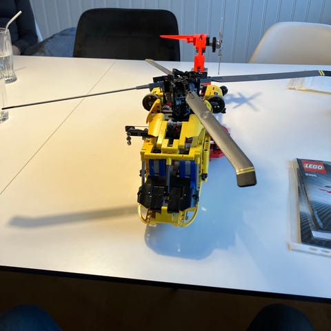 LEGO Technic Redningshelikopter byggesæt i røde, hvide og gule farver, lavet af plastik. Modellen er detaljeret og designet til børn og samlere, der interesserer sig for tekniske og mekaniske legetøj. Helikopteren har bevægelige rotorer og realistiske funktioner.nypris 1498