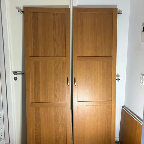 Flotte antikke døre, som har været brugt i vores entré. De er købt brugt i sin tid og sat op her. De er meget velholdte og fungerer perfekt. Vi har bare brug for en helt anden skabsløsning nu, og derfor sælger vi.