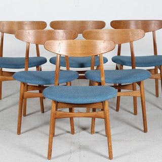 Stole i teak med stofbetræk. Der er huller i betræk. Selve stolene er rigtig fine uden ridser eller hakker.