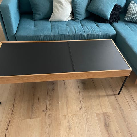 Bordpladen er aflang med runde hjørner, fire skrå bordben og en ekstra hylde under bordpladen, som er fremstillet i sort flet.