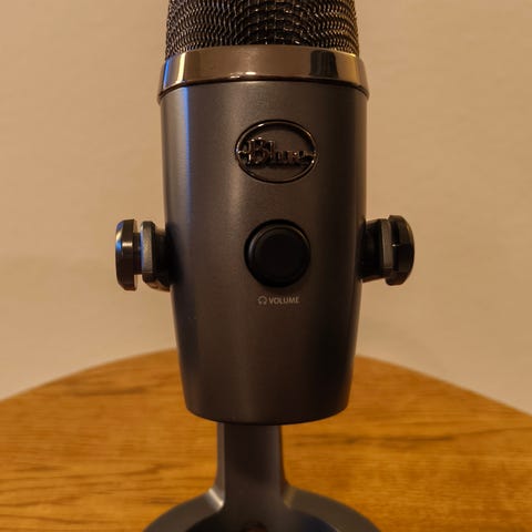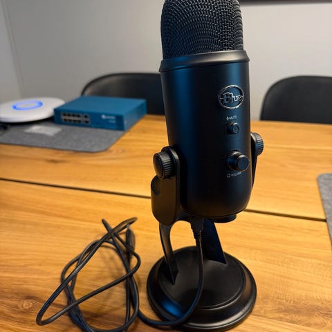 Blue Snowball USB Mikrofon med sort finish. Mikrofonen er kugleformet og monteret på et justerbart stativ med tre ben. Den har en USB-forbindelse til nem tilslutning til computere. Strømforsyning via 5V, 500mA. Velegnet til optagelse af tale og lyd til forskellige formål.