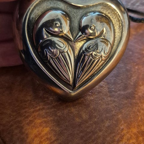 Henry Heerup årets kunstner smykke 1992 i hjerte formet vedhæng af sterling sølv med motiv af forelsket par omkranset af legende børn, nummereret 172/300. H. 4 cm.- bredde 5 cm.- vægt 74 gram incl. kæde. længde på kæden er 80 cm. Original æske medfølger.