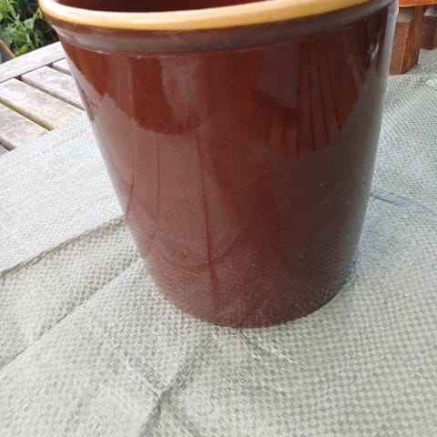 Gammelt syltekrukke i flot mat brun farve med mørkebrun glacering på indersiden.