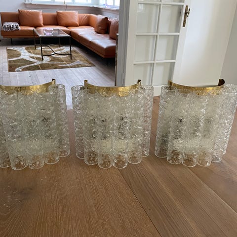 De er produceret af den ikoniske tyske lampeproducent Doria Leuchten i 1960'erne. Bagplade af stål med messing kanter, hvor der på 4 små kroge er monteret 4 Murano 'ICE GLASS' rør.