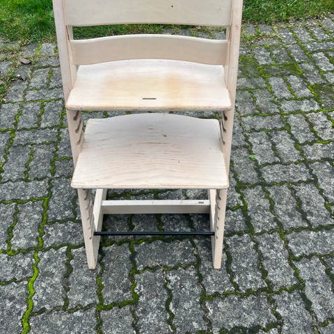 Stokke højstol i træ, designet til børn. Højstolen har justerbare trin og siddeplads, hvilket gør den velegnet til forskellige aldre og størrelser. Fremstillet i holdbart træmateriale med naturlig finish.