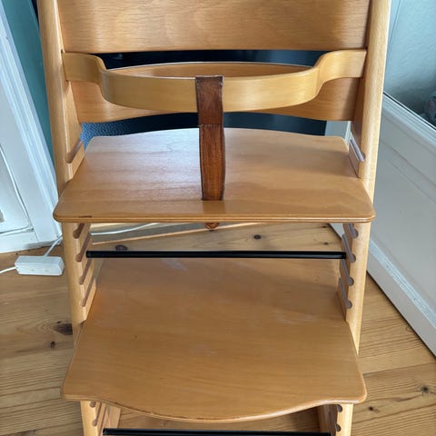Stokke Højstol i træ designet til børn. Stolen har justerbare trin for fodstøtte og siddeplads, hvilket gør den velegnet til forskellige aldre og størrelser. Den naturlige træfinish passer til flere indretningstyper og sikrer holdbarhed.