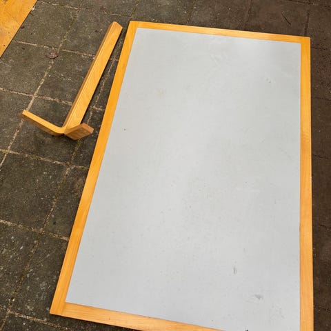 Brugt som ekstra spisebord. Med sorte bukke som ben. Kan også anvendes som skrivebord. Let at rengøre.