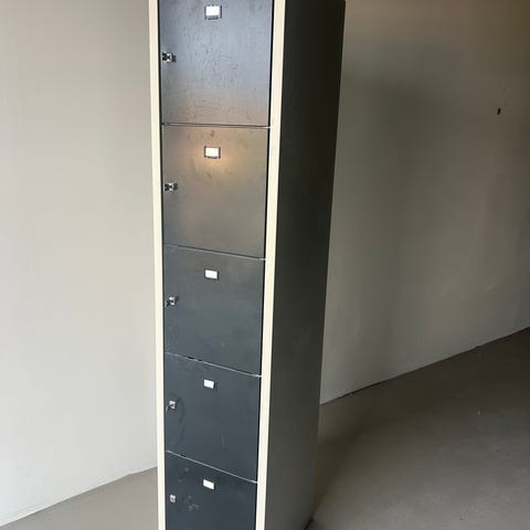 Metal kontorskab med flere opbevaringsmuligheder inklusive skuffer og et skab. Skabet har en grå finish og er egnet til opbevaring af dokumentmapper og kontorartikler. Indeholder et rum med hængemapper til organisering af papirarbejde.
