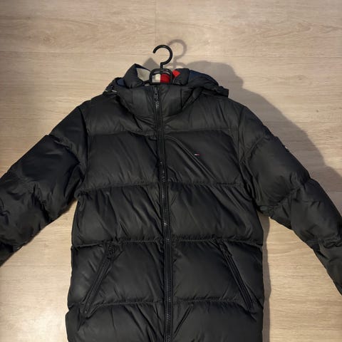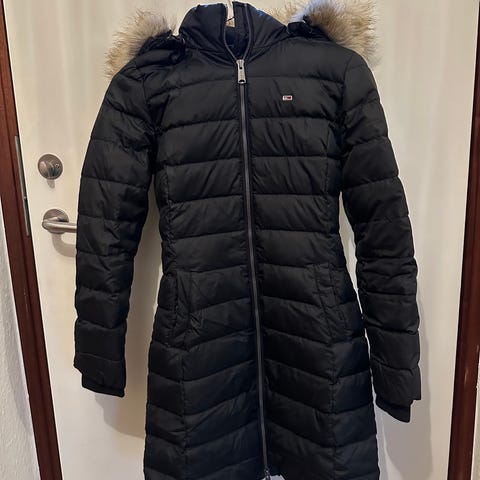 Tommy Hilfiger Vinterjakke i sort farve, størrelse S til kvinder. Jakken har en lynlås foran, to lommer med knaplukning og en hætte. Materialet er designet til at give varme og komfort i koldere vejrforhold.
